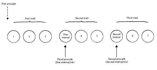 The merciless struggle among the first three qualities produces a true "wheel of anguish." The world of the first triad of sevenfoldness is a "dark valley," a virtual hell. Boehme speaks of "an anxious horrible quaking, a trembling, and a sharp, opposite, contentious generating." Something must happen to allow the "childbirth," the passage to life, to manifestation. It is precisely at this point, when the wheel of anguish turns frantically on itself, in a chaotic, infernal whirlwind, that a principle of discontinuity must be manifested, to open the way for true evolutionary movement. This principle of discontinuity is none other than the third principle, which appears as the fiat of manifestation, the creative word of God. Boehme calls this discontinuity a "flash": "Behold, without the flash all the seven spirits were a dark valley. " The insane movement of the wheel of anguish stops in order to transform itself into harmonious movement. It is now that life can be born, that God is born. The fiat of manifestation, generated by the third principle, becomes an integral part (although merely virtual, because it corresponds to an invisible interruption on the level of manifestation) of the second triad of the sevenfold cycle, which equally includes the fourth and fifth qualities: "Now these four spirits move themselves in the flash, for all the four become living therein, and so now the power of these four riseth up in the flash, as if the life did rise up, and the power which is risen up in the flash is the love, which is the fifth spirit. That power moveth so very pleasantly and amiably in the flash, as if a dead spirit did become living, and was suddenly in a moment set into great clarity or brightness." The fact that the fourth and the fifth qualities are intimately linked to the lightning flash, and therefore to the third principle, is thus clearly affirmed. The cold fire of the first triad thus transforms itself into a hot fire from which light can burst forth: "The fourth property thus plays the role of a turntable or pivot of transmutation for the whole system, Jean-Francois Marquet has written. I would be tempted to say rather that the turntable is located in the interval between the third and the fourth quality, for it is there that the action of the fiat of life, of manifestation, takes place. "Birth" does not mean a complete manifestation of the light. With the second triad, God is born, he becomes conscious of himself, but he does not yet manifest himself fully. A second principle of discontinuity must intervene so that the evolutionary movement can continue. The fiat of affirmation, of the light fully revealed, the heavenly fiat is necessarily the action of the second principle. "The second fiat is found at the fifth degree," Pierre Deghaye correctly affirms. More precisely, it is found in the interval between the fifth and the sixth quality.