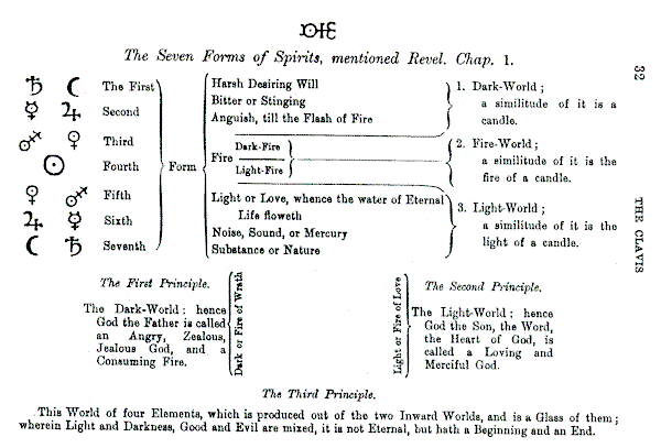 Following is a brief, modern interpretation of the "Threefold Structure" and the "Sevenfold Self-Organization of Reality". It is taken from the book: "Science, Meaning, and Evolution", written by Basarab Nicolescu, a physicist working with "Quantum Physics". Buy your INEXPENSIVE books at one of these sites: Amazon, Alibris, Abebooks. Download a FREE .pdf [ Here ]. To skip this, and go directly to "The Key", CLICK Here. You may also download an eBook containing the full "Collected Works of Jacob Boehme by clicking [ Here ]. A: THE THREEFOLD STRUCTURE In the cosmology of Boehme, reality is structured in three parts, determined by the action of three principles: "Now thus the eternal light, and the virtue of the light, or the heavenly paradise, moveth in the eternal darkness; and the darkness cannot comprehend the light; for they are two several Principles; and the darkness longeth after the light, because that the spirit beholdeth itself therein, and because the divine virtue is manifested in it. But though it hath not comprehended the divine virtue and light, yet it hath continually with great lust lifted up itself towards it, till it hath kindled the root of the fire in itself, from the beams of the light of God; and there arose the third Principle: And it hath its original out of the first Principle, out of the dark matrix, by the speculating of the virtue [or power] of God." These three principles are independent, but at the same time they all three interact at once: they engender each other, while each remaining distinct. The dynamic of their interaction is a dynamic of contradiction: one could speak of a negative force corresponding to the darkness, a positive force corresponding to the light, and a reconciling force corresponding to what Boehme called "extra-generation." It is a question of a contradiction among three poles, of three polarities radically opposed but nevertheless linked, in the sense that none of the three can exist without the other two. The three principles have a virtual quality, for they exist outside our space-time continuum. As a result they are, in themselves, invisible, untouchable, immeasurable: "We understand, then, that the divine Essence in threefoldness in the * unground dwells in itself, but generates to itself a ground within itself . . . though this is not to be understood as to being, but as to a threefold spirit, where each is the cause of the birth of the other. And this threefold spirit is not measurable, divisible or fathomable; for there is no place found for it, and it is at the same time the unground of eternity, which gives birth to itself within itself in a ground." The foundation of the Trinity is "subject to no locality, nor limit [number], nor place. It hath no place of its rest. * TRANSLATOR'S NOTE: Boehme's term "unground" - Ungrund in German and sans-fond in French - refers to this mysterious "bottomless state" which at the same time serves as the base or foundation or ground where the Trinity dwells. It is important to stress that it is exactly this process of contradiction which allows manifestation. The hidden God (Deus absconditus) is not pure transcendence. Through the two other poles of this ternary contradiction, he can show himself, he can manifest, he can respond to the wish to understand himself. Thus the three forces corresponding to the three principles will be present in every phenomenon of reality: "And no place or position can be conceived or found where the spirit of the tri-unity is not present, and in every being; but hidden to the being, dwelling in itself, as an essence that at once fills all and yet dwells not in being, but itself has a being in itself. . . ." God hidden thus becomes God manifest (Deus revelatus). In this context, it is extremely interesting to remark the role that Boehme attributes to our own world. The three principles engender three different worlds which moreover are overlapping - the world of fire, the world of light, and the exterior world: "And we are thus to understand a threefold Being, or three worlds in one another. The first is the fire-world, which takes its rise from the centrum naturae. . . . And the second is the light-world which dwells in freedom in the unground, out of Nature, but proceeds from the fire-world. . . . It dwells in fire, and the fire apprehends it not. And this is the middle world. . . . The third world is the outer, in which we dwell by the outer body with the external works and beings. It was created from the dark world and also from the light-world. . . . The exterior world, our world, appears as if it were a world of true reconciliation. It is not the world of the Fall, the world of man's guilt, of his downfall into matter. As Pierre Deghaye remarks pertinently, our world is a world of reparation: "The body of Lucifer is set on fire and it is destroyed. But this body was the universe before ours. It is the result of this catastrophe and in order to repair it that our world was created. Our world is the third principle." All the grandeur of our world resides in the incarnation of these three principles. First of all, the threefold structure of reality is inscribed in man himself. Man is the actualization of this threefold structure:" . . . so also in like manner is every mass or seed of the Ternary or Trinity in every man," Boehme tells us. Human nature, merging the three principles, "understands therefore, at least potentially, the totality of divine manifestation." What man makes of this human nature is, of course, a whole other story. In our modern world, man has forgotten that he is potentially the incarnation of three principles. The very words "three principles," not to mention their meaning, seem to us strange and absurd. We are, evidently, far from the work of spiritual alchemy, based on the balance of our own threefoldness, a work to which Boehme invites us, and which alone could give this world a real meaning. Otherwise our world is dead, absurd, accide